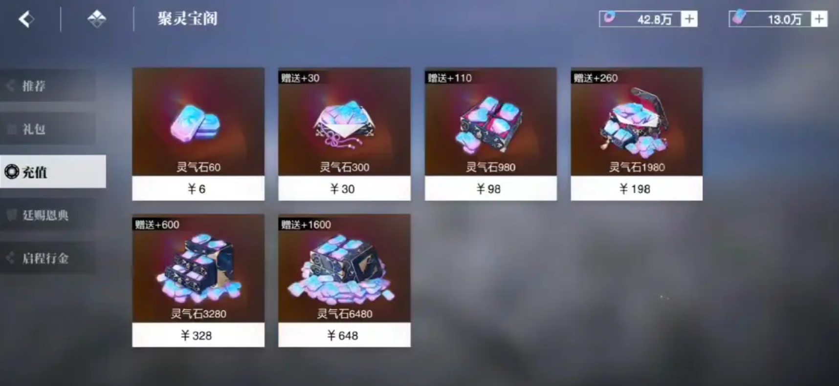首先是灵玉商店,这是能稳定兑换灵玉的重要途径,这里主要就是出售灵玉的各种礼包,有些商品是可以通过充值直接获得的,也就是氪金能购买到指定数量的灵玉,这种方式是非常高效的,不过这种氪金的方式也需要理性,避免过渡消费。