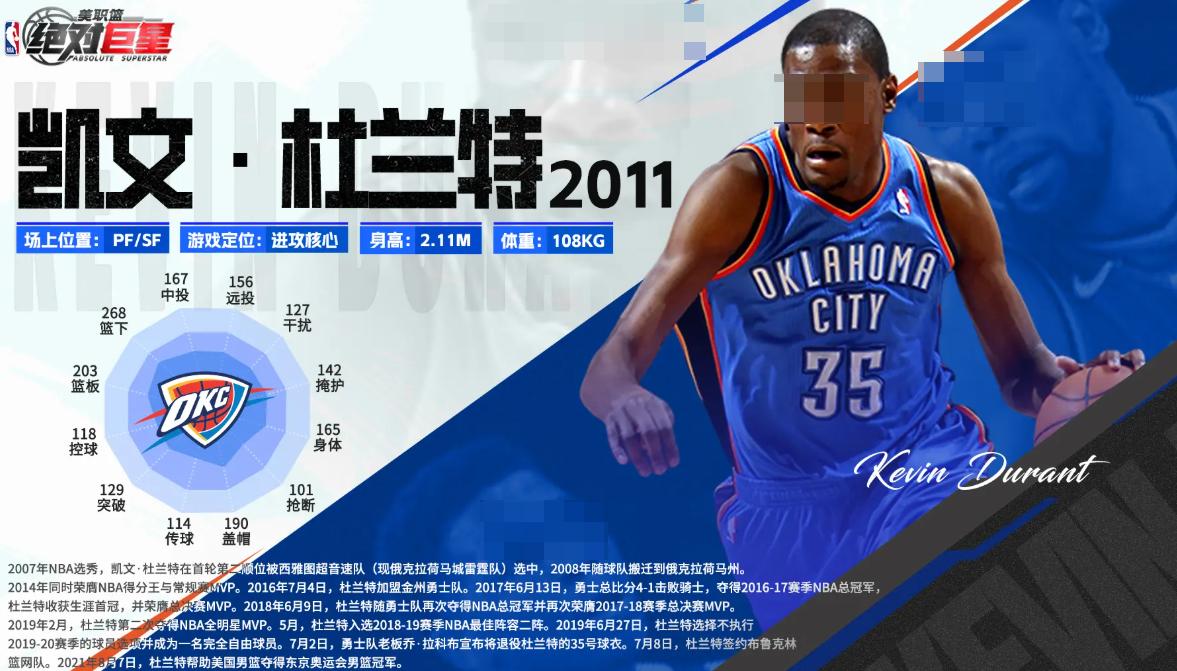 杜兰特,死神,技能“一击中的”保证使用后出手必定为三分球,再加上“三分提升”让他在远投方面表现超强。作为有着超远射程能力的球员,杜兰特在面对对方防守球员时候,可以在内线、中距离、三分线,利用他的三分威胁拉开空间、制造错位优势。