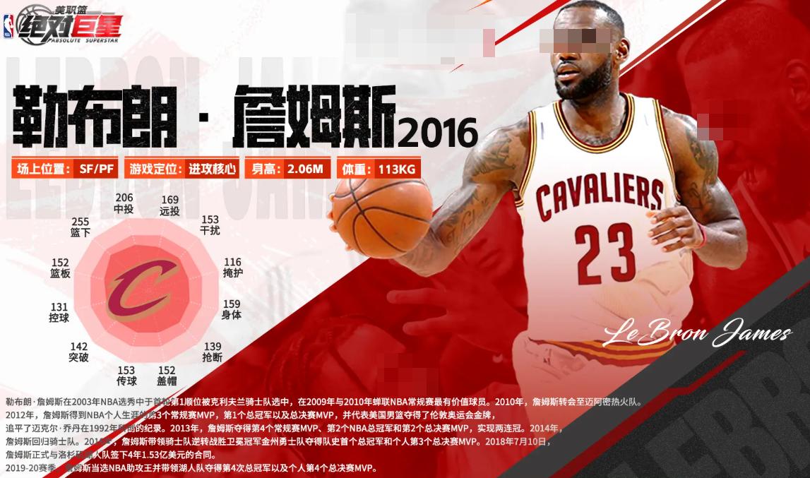 詹姆斯,现役goat,技能“飞天遁地”使用后出手必定为上篮,配合“上篮提升”提升自身上篮成功率并削弱对手防守,很好的凸显了詹姆斯在突破内线时的不讲理,使其在打破防守、制造杀伤以及拉扯空间方面表现抢眼。对于想要主攻禁区、打快攻、冲击篮筐的玩家来说,詹姆斯就很适合。