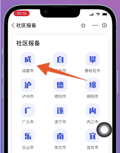 进入社区报备界面后,选择所在的【城市】并点击,以成都市为例。