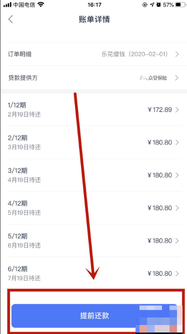 点击打开相应的账单以后,然后我们把页面下翻即可看到【提前还款】的按钮,如下图所示。