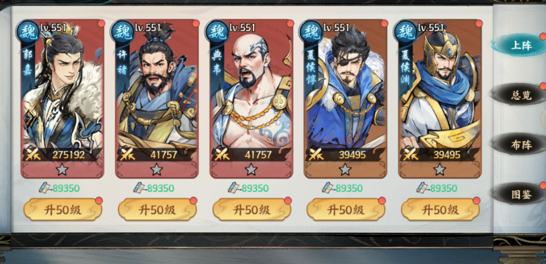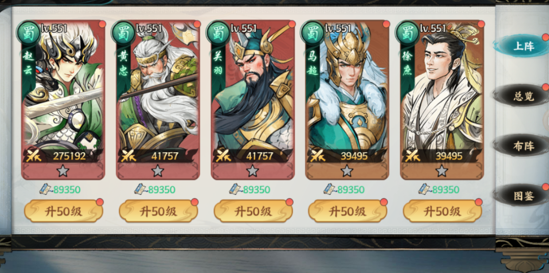 第二类推荐阵容包含蜀将联动流与控制眩晕流。蜀将联动流推荐使用诸葛亮、张星彩、关羽、张飞、赵云的组合,依托蜀国专属羁绊及阵亡增益机制,由关羽和赵云构成双核输出体系,张星彩与张飞承担抗伤与附加伤害任务,诸葛亮负责全队增益辅助。此阵容适合偏好策略布局与阵营协同效应的玩家。控制眩晕流则推荐曹仁、郭嘉、张辽、甄宓、辛宪英,依靠高频率眩晕与减益技能打乱对手节奏,张辽主攻单体目标,甄宓与辛宪英提供持续回复能力,增强团队持久作战性能。