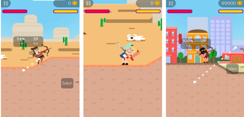 本作是一款竖屏操作为主的抛物线射击手游,美术风格诙谐夸张,操作机制别具一格。玩家需控制2D卡通形象的弓箭手,通过计算角度与力度精准命中目标。沙漠、城市等多种地图环境增加挑战变化,而丰富的弓箭类型则赋予战斗更多策略维度。其核心玩法类似经典“弹弹堂”,强调物理轨迹判断,适合喜欢动脑操作的玩家体验精准打击的乐趣。