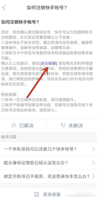 然后我们在里面可以看到注销快手账号需要满足的条件,然后点击【点击链接】蓝色文字,如图所示。
