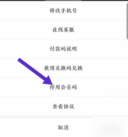 然后能看底部会弹出一个选项界面,点击停用会员码。如图所示