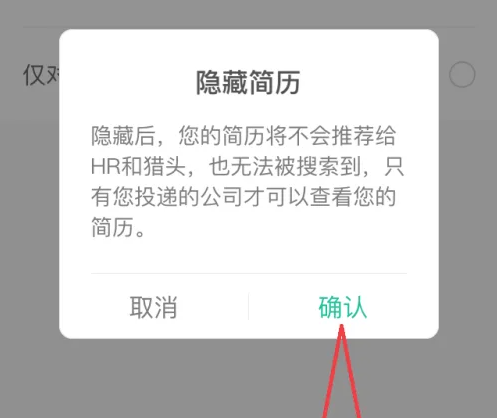 点击以下窗口中的【确认】,即可隐藏自己的拉勾招聘简历。