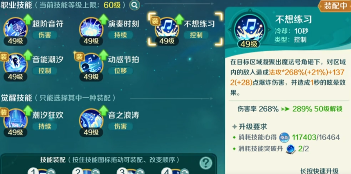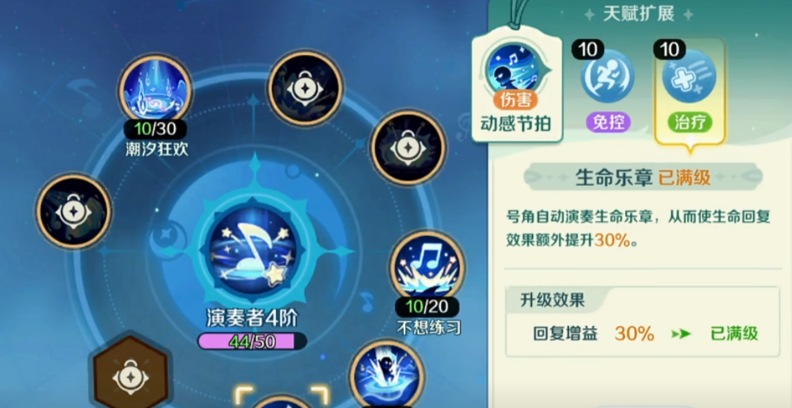队伍里面如果缺少一些治疗效果的话,大家可以降低在演奏时刻这个技能上面的加点投入,如果不需要这么多爆伤能力,大家根据他的能力可以选择的是音能潮汐这个技能进行支援,因为其中如果有一些稳定的效果,这个技能在集中点1级就可以达到一些比较好的回报率,根据这样的效果使用,在这里性价比还是比较高的,只需要分出来一点技能点数就可以了,然后是在不想练习这个技能上面也是比较推荐大家给他加点的,这个技能使用的时候,可以利用他在目标区域之内领取出来的魔法进行一个区域输出,造成的输出到了268%的数值,在其中点出来爆炸伤害的话,还会有一个1秒的眩晕效果,可以给敌方带来控制,利用这1秒时间大家就可以做出很多的链接操作。