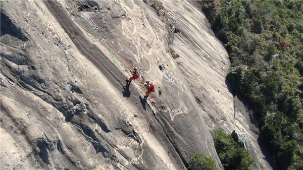 早上6时许,消防员立即借助自然光线对崖壁进行了精准勘察,发现被困男子距离山顶约有200米左右的高度差,其间的崖壁近乎垂直,消防员迅速寻找坚固处设置锚点,逐步接近被困男子。