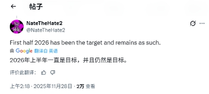 此次关于发售窗口的新消息来自业内爆料者Nate The Hate。他在社交平台X上回应玩家提问时表示,《地平线6》原定目标就是2026年上半年,而《GTA6》的延期并未改变这一方向。这并非他首次谈及该时间段,因此更像是对先前信息的再次确认。