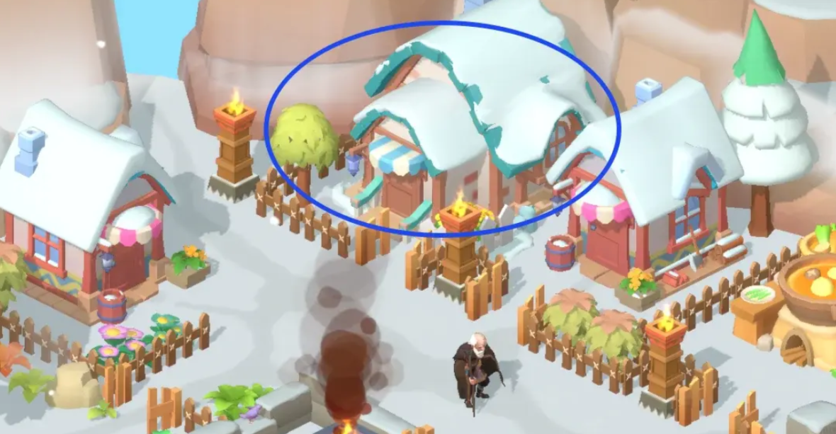 前往冬木岛,这里被白雪给包裹,我们修复此处的建筑能额外得火炬,向着前方前进下图中每一间房屋点一下给金币,向左走路上有一朵四季花可以采集,拿着这多花到海边的小屋处进行交付能获得秘宝奖励,最后向着小岛的中心出发,在此处有池塘,点击绿色动态精灵能拿到奖励。