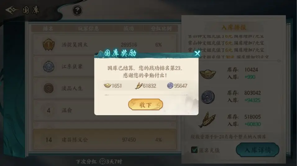 每四天会进行一次分红结算,会根据本国成员的战功排名,用邮件发放分红的奖励。