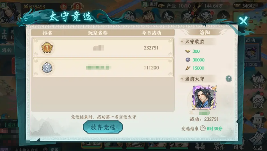 城池太守:在主城、皇城、州城以及关口,每天都会发起竞选,当日参选并获取战功排名最高的担任太守。