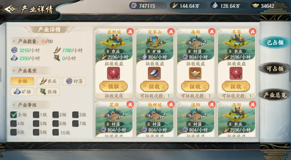 至于征收情况,牧场收缰绳,矿场收玄铁,村落收元宝,农庄收将领碎片。