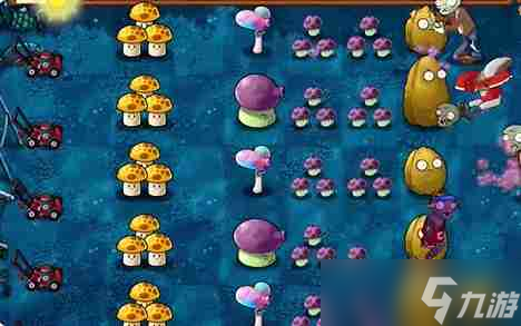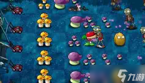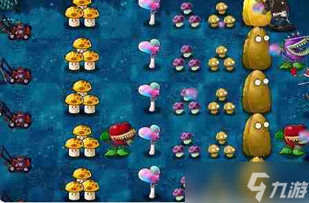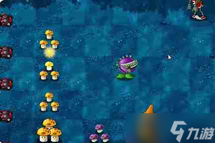 3、将樱桃炸弹种在食人花上,在中间种植多个大喷菇和多格小喷菇。