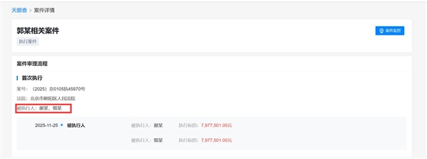时间:2025-12-01 | 作者: | 阅读:012月1日消息,天眼查显示,谢孟伟(嘎子哥)、郭珊珊(谢孟伟妻子)新增一则被执行人信息,执行标的约797.75万元,执行法院为北京市朝阳区人民法院,案号为(2025)京0105执45970号。