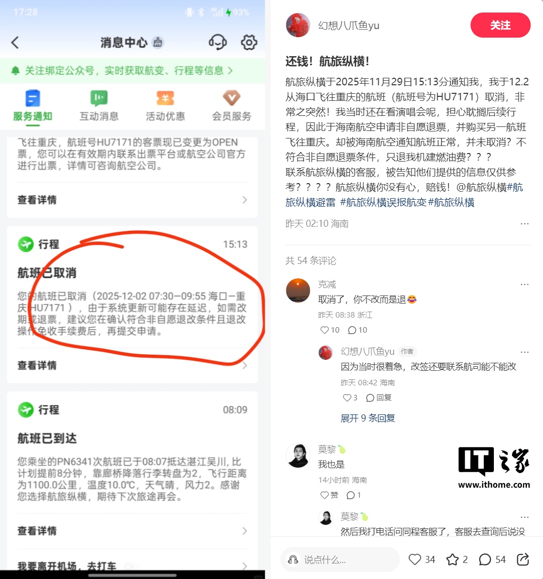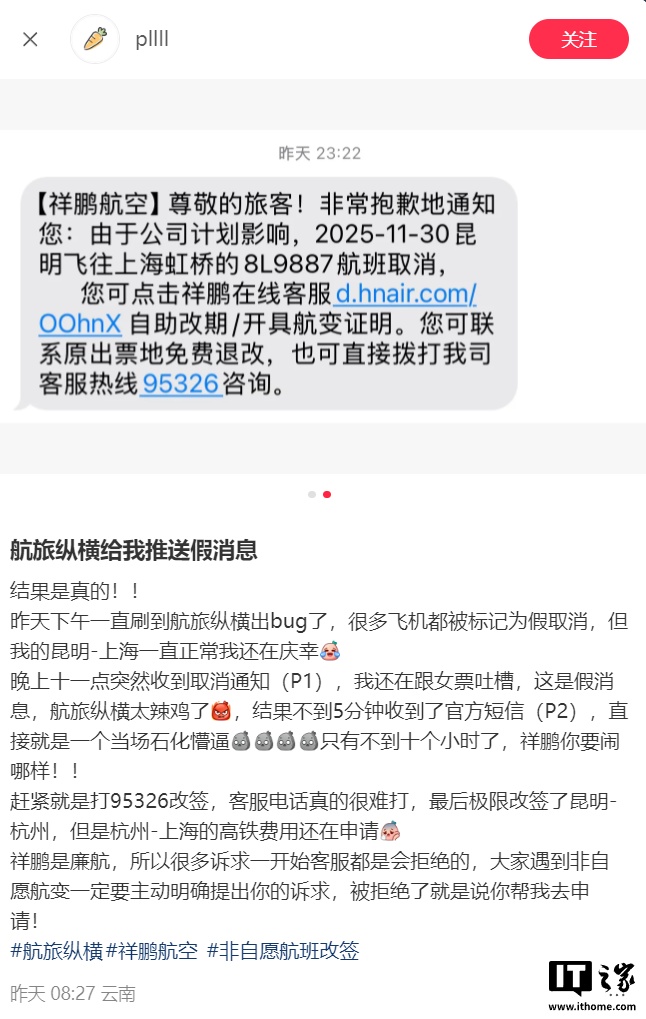 时间:2025-12-02 | 作者: | 阅读:012 月 1 日消息,据广州广播电视台今日报道,多位网友反映,在 11 月 29 日下午 15:00 左右,收到来自航旅纵横的航班取消提醒。