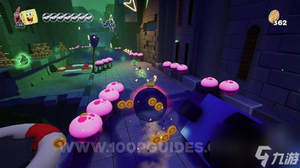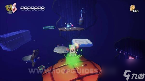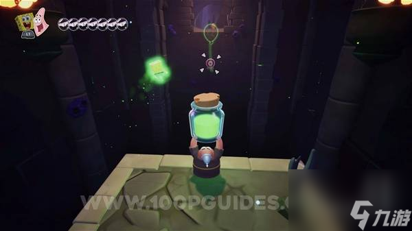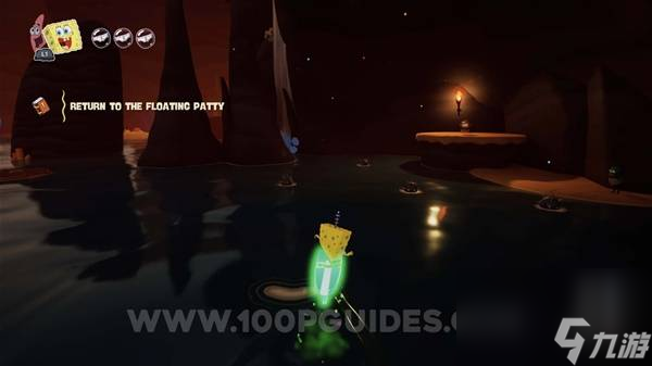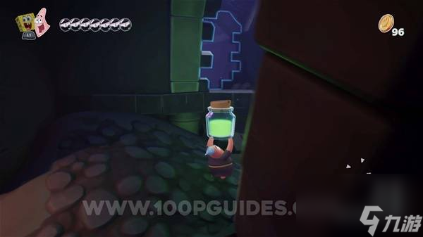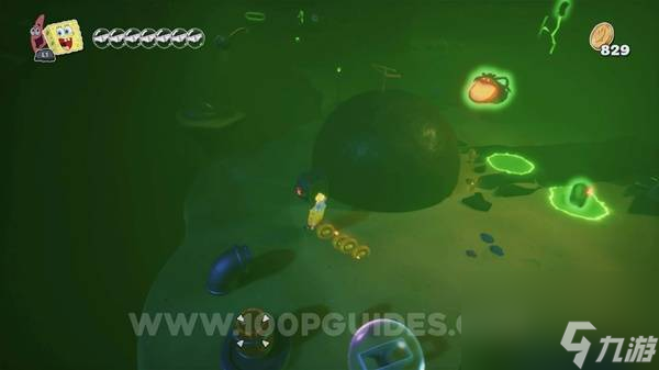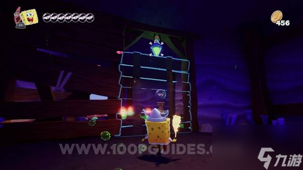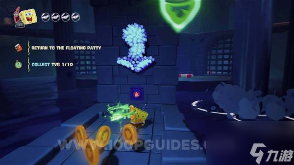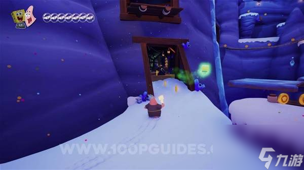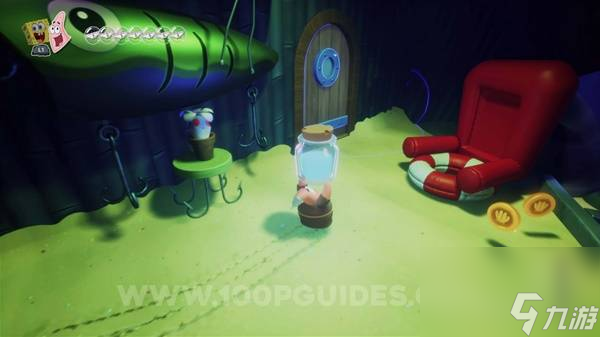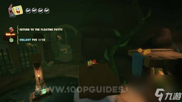 比基尼海滩——第一部分幻灯片后,你将进入一座被毁坏的菠萝屋。首先,爬到顶端,和帕特里克一起拿灯笼。然后带着灯笼下楼,穿过门,找到浴缸旁的电视。