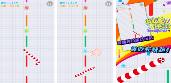 此款作品无需稳定网络即可畅玩,适合各类环境下的休闲娱乐。游戏开始时会显示一条色彩鲜艳的蛇,前进路线中布满障碍物,例如断续排列的砖块以及散落的食物。玩家通过手指点击屏幕控制蛇体移动,以S型轨迹绕开阻碍,并成功获取指定目标物以延长身体长度。
