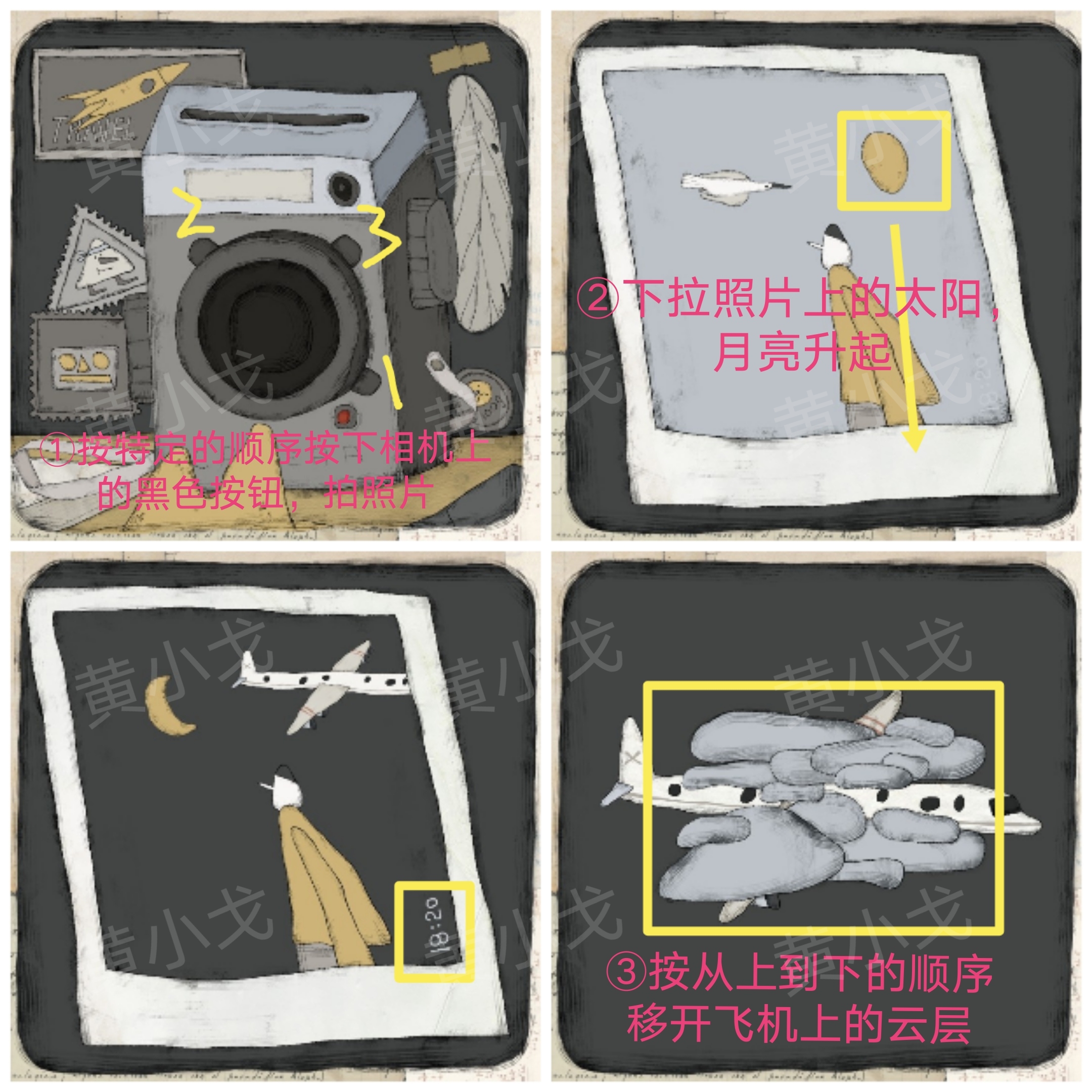 3、按特定的顺序按下相机上的黑色按钮,拍照片;下拉照片上的太阳,月亮升起;按从上到下的顺序移开飞机上的云层
