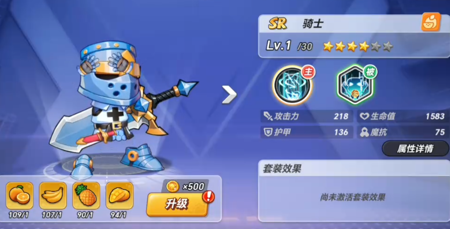 骑士属于一个SR级别的角色,有着高额的基础成长属性,能够带来强大的防御力以及生命力,当然攻击能力同样不俗。戴上了银翼骑士皮肤之后,显得更加帅气了!宛若天降的天使一般,仿佛能给予敌人致命一击。想要变得更强的话,就可准备各种水果材料,即可进行快速升级!
