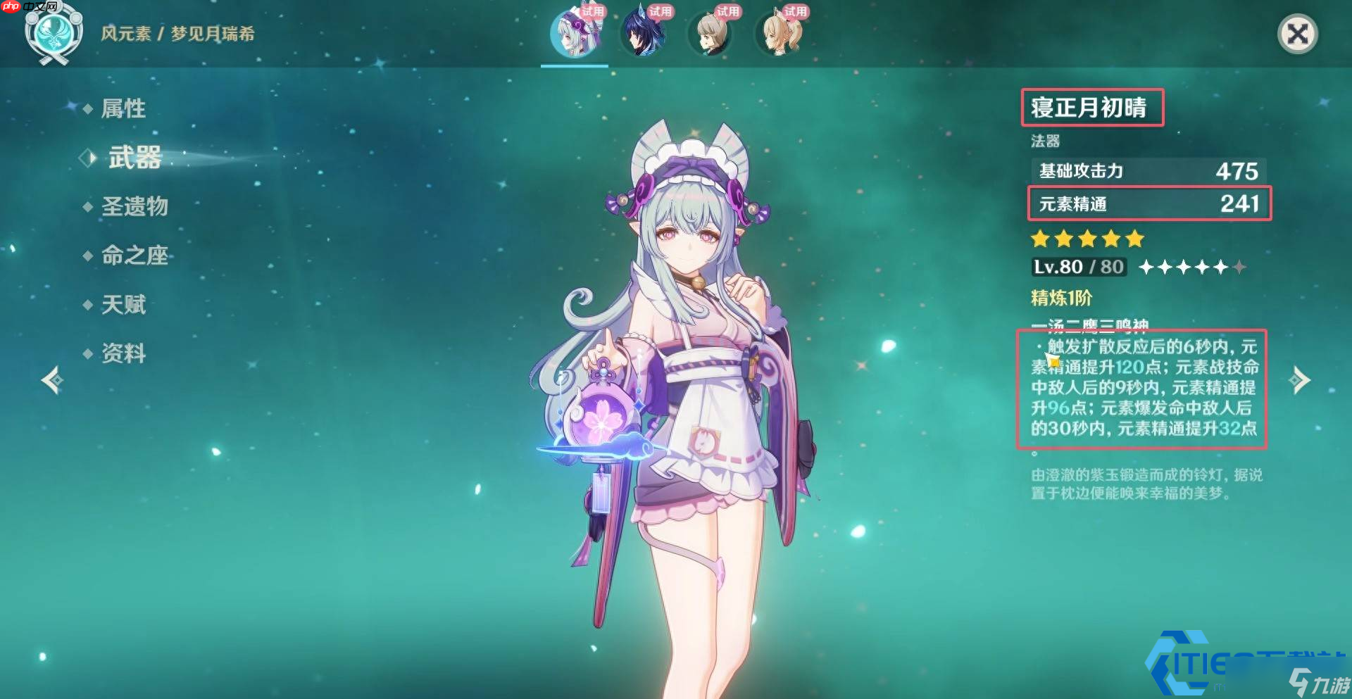 鉴于她的所有核心机制均依赖元素精通,堆叠该项属性应为首要目标。圣遗物推荐选择主词条为元素精通的套装,如“流浪大地的乐团”或“饰金之梦”。武器方面也应倾向提升元素精通的选择,例如西风猎弓、试作澹月等。理想状态下,将元素精通推至800以上,你会发现扩散伤害出现明显跃升。