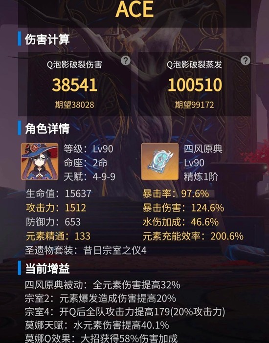 建议:核爆莫娜带上班尼特、砂糖(万叶)和香菱(烟绯、可莉、安柏)。玩法涉及高等元素理论,所以玩家在玩的时候要注意一些细节,特别是莫娜开大后要原地等到2秒左右,然后引爆就可以打出高额的水元素伤害。(建议多拿冰树练习)