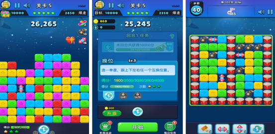 一款主打爽快消除体验的游戏,带来不断升级的成就感。每个关卡设有明确分数目标,例如累计得分达到1万方可开启后续内容。屏幕上随机分布着多彩方块,玩家点击同色区域可一次性清除多个单位,获取高分。同时配备多种辅助道具,如炸弹、全屏清除等,助力高效通关。