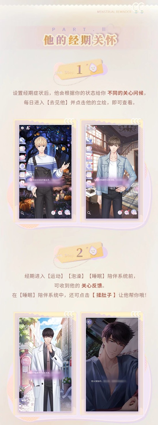 2.经期进入【运动】【泡澡】【睡眠】陪伴系统前,可收到他的关心反馈。在【睡眠】陪伴系统中,还可点击【揉肚子】让他帮你哦!