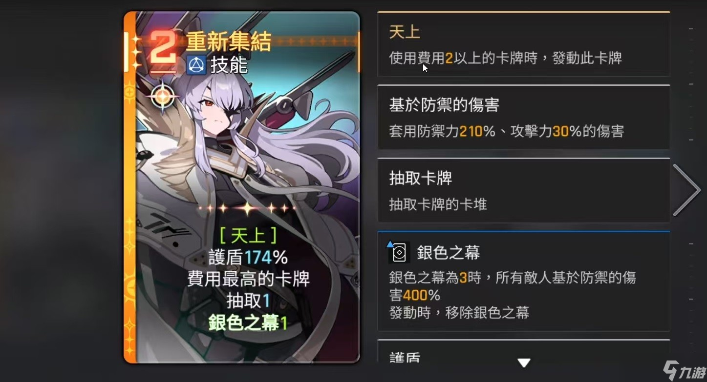 其余独特卡牌包括:“天鹰长剑”,可对全体敌人造成150%防御伤害,若手牌中持有“秃鹰发射”,则此卡费用+1但伤害翻倍至300%,建议优先于“秃鹰发射”打出以最大化收益;“压制”提供200%防御护盾并施加1点韧性削减;“重新集结”可在获得120%护盾的同时,抽取一张最高费用的手牌,增强后续回合调度能力;而“绝对守护”不仅提供高额护盾,还能保留当前所有手牌至下一回合,极大提升了策略灵活性和容错率。