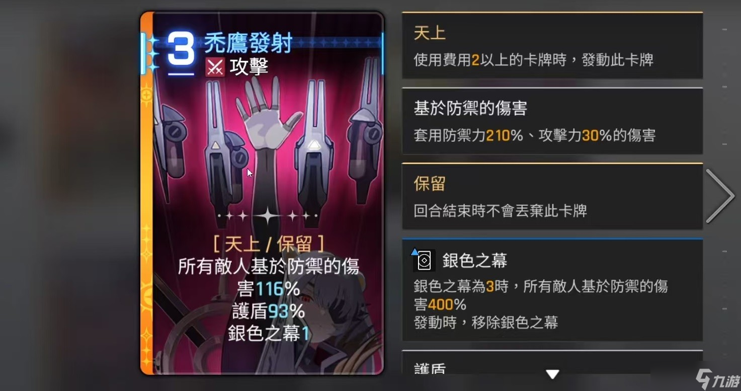 在独特卡牌方面,她的核心机制围绕“秃鹰发射”展开——该技能不仅能对全体敌人造成100%防御值的范围伤害,同时为自己附加80%防御量的护盾,并叠加一层“银色之幕”效果。当“银色之幕”累积至三层时,将触发一次全屏爆发,对所有敌方单位造成高达400%防御值的真实伤害,并清除层数,实现强力清场。