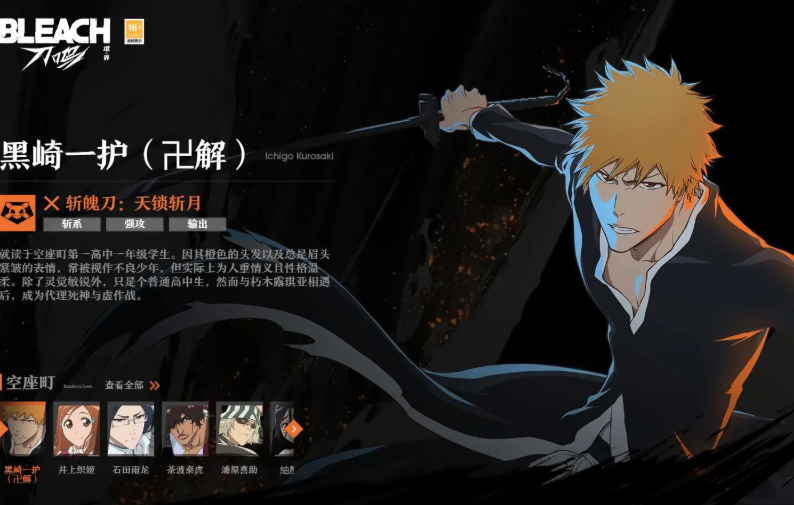 黑崎一护作为主C,承担全队主要物理输出职责。其常态普攻具备多段斩击判定,配合分支技可触发额外倍率加成;进入卍解状态后,月牙天冲作为终结技拥有高额单体爆发与范围清场能力,常被玩家视作队伍核心大招使用。此外,其封灭类效果对斩系伤害有直接增益,进一步强化该流派的数值上限。