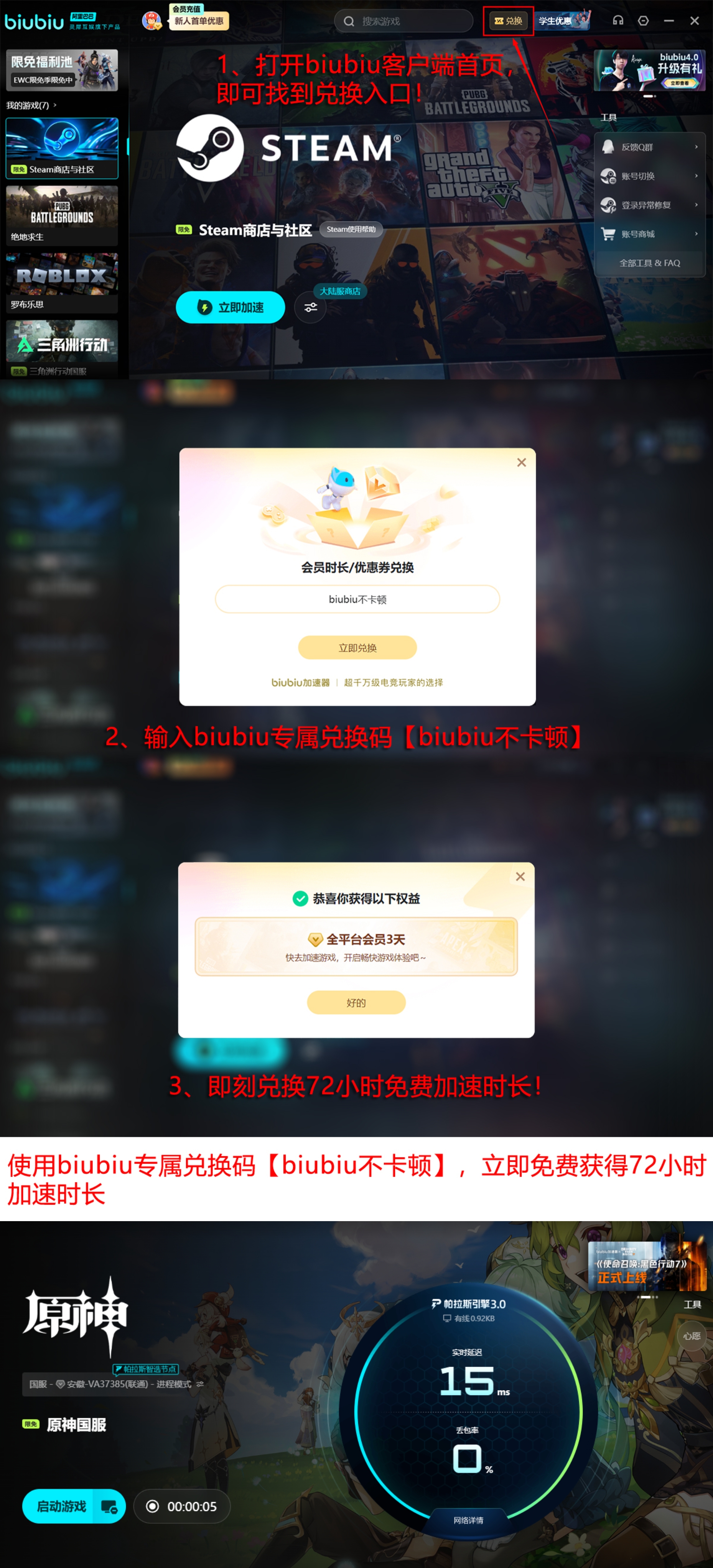 对于初次接触加速工具的用户来说,可享受新用户注册即赠24小时免费加速时长的福利,同时无论新老用户均可通过输入【biubiu不卡顿】兑换码额外获得3天服务时间。双重福利叠加最高可达96小时,让用户充分体验优化后的高速连接效果后再决定是否续费,政策十分贴心。
