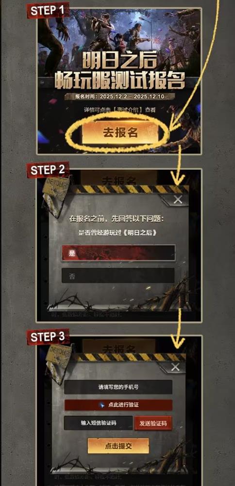 进入活动页面后,点击“去报名”,前往回答几个关于《明日之后》的简单问答题,最后填写正确的手机号并验证,即可成功报名。完成报名后,别忘了分享链接,邀请与自己志同道合的小伙伴一起参与到测试中来。