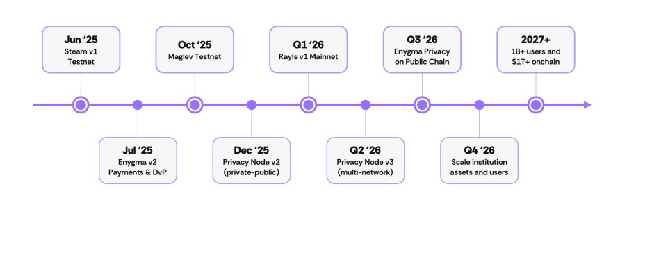 2025年6月:Steam v1 测试网2025年10月:磁悬浮测试网2025 年 12 月:隐私节点 v2(私有-公共)2026 年第一季度:Rayls v1 主网2026 年第二季度:隐私节点 v3(多网络)2026 年第三季度:Enygma Privacy on Public Chain2026年第四季度:企业资产和用户规模扩展2027 年及以后:用户超过 10 亿,链上资产超过 1 万亿美元