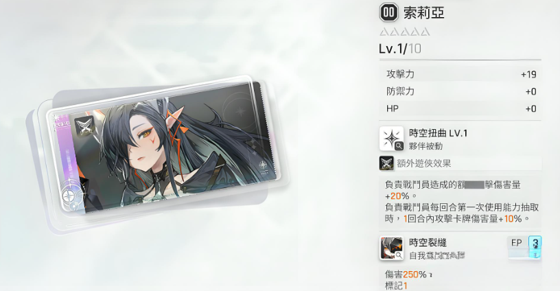 接下来介绍的是远程输出方向的职业——游侠。这类角色擅长通过远程攻击卡牌进行稳定输出,索利亚就是该职业的典型代表。她不仅自身拥有高效的远程打击手段,还能为队伍中的战斗型成员提供显著增益:所有同类型战斗员可享受20%的伤害加成。此外,在每个回合开始时,队伍中每名战斗员首次抽卡将额外获得10%的当回合伤害提升,这一机制极大地增强了团队的整体输出节奏。