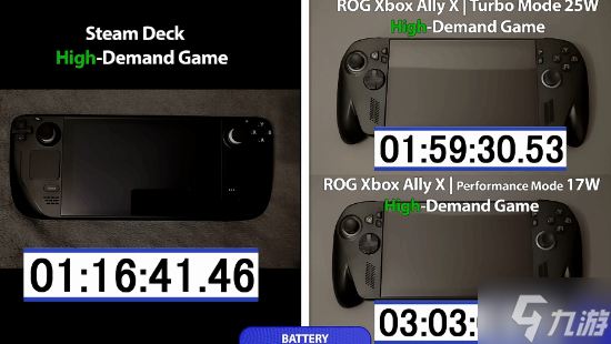 而电池续航来说,ROG Xbox Ally X在不同模式下达到了3小时和近2小时的续航,而Steam deck则仅有1小时16分钟,电池续航上有较大的差距。
