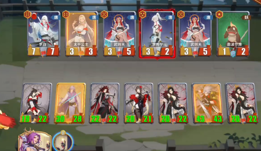 输出端,李白、霍去病、王翦、麒麟是核心。李白能多攻击一次并召唤剑意,有清毒能力;霍去病攻击时自带屏障;王翦能不断触发斩将与屏障,有成为无限成长主C的潜力;麒麟则是全阵营适配,每当刷牌时,全队还能获得+2/+2的成长,自身还能搭配连击与不屈护盾。