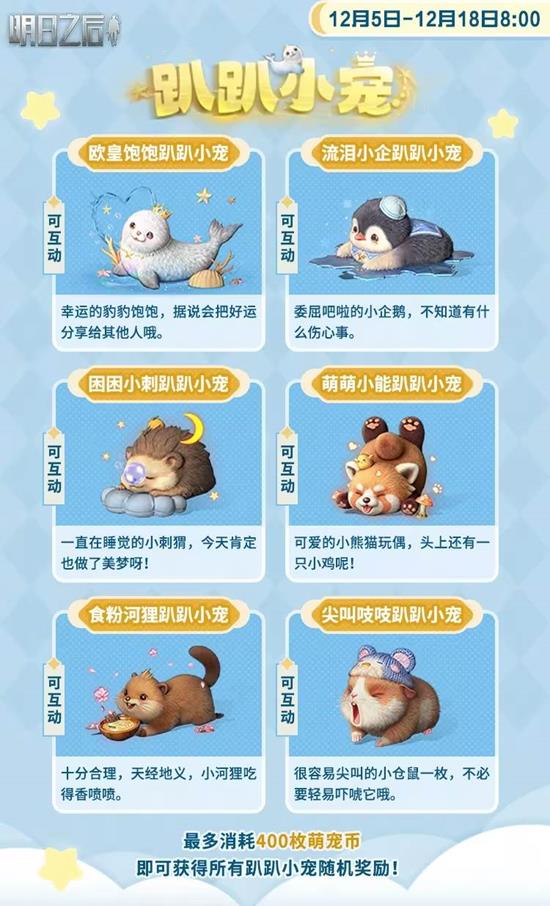 获取方式依旧走抽奖路线,活动池不放回,最多消耗400枚萌宠币就能一次性打包全部奖励。欧皇附体可能一发入魂,非酋也无需担心,次数堆满必得完整家族。首次抽中任意趴趴,系统还会白送专属展示柜【宠偶陈列柜】,可把战利品摆成一排,向访客炫耀软萌实力。限时窗口截至12月18日早8点,错过就要等返场,届时币价、规则都可能调整,想薅现在最稳。