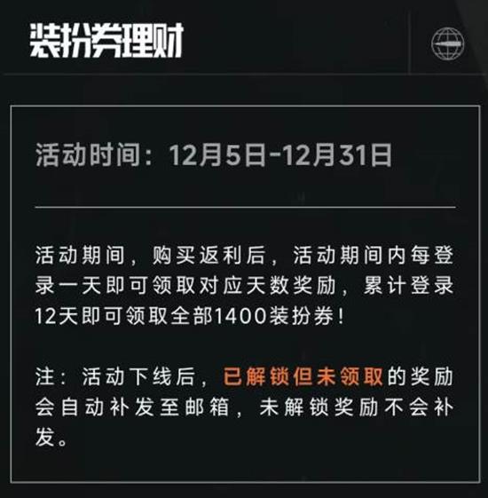 装扮券理财活动将于12月5日至12月31日进行,活动期间,购买返利后,活动期间内每登录一天即可领取对应天数奖励,累计登录12天即可领取全部1400装扮券!活动期间,已解锁但未领取的奖励会自动补发至邮箱,未解锁奖励不会补发。
