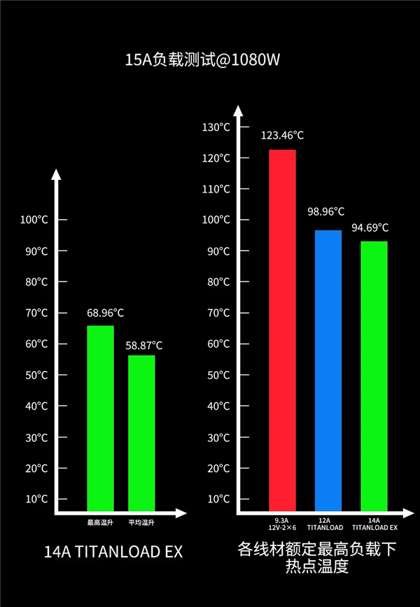 实际测试中,在15A电流(通过功率高达1080W)的超设计目标负载下 ,TITANLOAD EX强流线的最高温度仍仅为94.69℃;在应对常规的9.3A/669瓦负载下,6处探针最高温度更是仅有53.53℃。