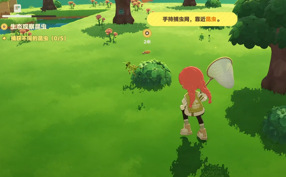 首先玩家们先将手中的道具切换成捕捉道具,捕捉道具分为捕捉网和诱捕盒两类,捕捉蝴蝶等飞行昆虫优先使用捕捉网。这时候玩家们的移动速度会明显减慢,这是因为昆虫是很容易受到外物惊扰的,哪怕是快速移动产生的气流都可能让它们警觉。所以玩家们在捕捉的时候需要静悄悄地捕捉,避免做出跳跃、快速转向等大幅度动作,这样才能保证虫子能捉到。