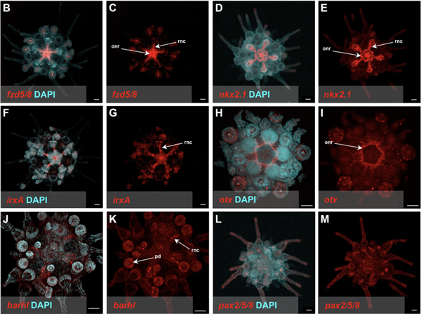 这些神经元分布在海胆全身,多达数百种,而且同时表达着棘皮动物特有的“头部”基因,以及在脊椎动物中枢神经系统中普遍存在的基因。