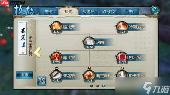 未名斩为控制核心,点满后结合天书加成可达成长达3秒的群体定身效果,团战中压制力极强。厚土咒和密云咒提供关键防御支撑,必须点满以保障战场存活。