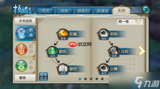 天书路线选择戮魂系,第一卷优先点亮炽热、斗志、歃血三大核心节点;第二卷重点强化魔心与乱舞,提升暴伤转化效率;第三卷激活震慑与妄言,大幅增强控制稳定性。