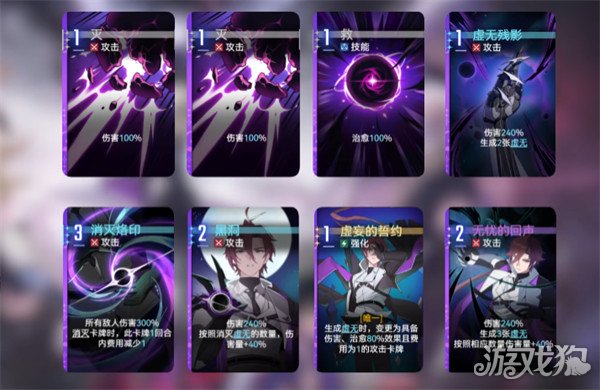 虚妄的誓约就可以优先选择开战的时候用,有先手的优势,灵光一闪的带来的起跳效果为战斗开始的时候带来的又是是大家一开始必定抽取到这张卡,也能确保战斗初期虚无就在有效状态当中,虚无残影的灵光一闪重点关注赋予生成两张虚无蒸发的效果,蒸发的效果是回合结束时若仍在手牌中会自动进入消灭卡堆,也能在费用不足时通过自动消灭变相叠加虚无数量缓解费用紧张的问题,接下来是大招,大招需消费5AP,基础倍率仅200,但输出会随手牌中虚无数量提升,凯隆的野生卡虚无属于独特卡牌,独特卡牌的伤害护盾、治疗量提升这一潜力点能直接强化功能卡的输出与治疗效果。