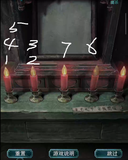 4. 点击祠堂内中间的蒲团,获得带有花朵图案的磁针,使用蜡烛放在左边的神龛上,根据以下顺序点击蜡烛,获得牌位
