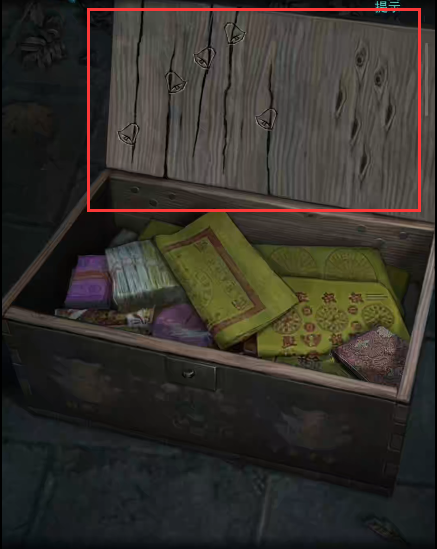 3. 同时盒子上还画着5个铃铛和6个节疤,和看守大门的牛头马面的特征很像,根据铃铛从左到右的顺序按照数字排列就是53214,根据这个顺序点击牛头的铃铛,雕像产生变化,根据节疤上只有最顶上两个是开眼,其余都是闭眼的信息点击马面,雕像产生变化,大门打开。