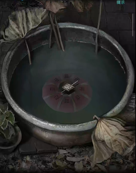 6. 将磁针放在外面的水缸里,可看见磁针的指针指向两个卦象,根据卦象点击原捡到磁针位置,获得何氏祖谱。