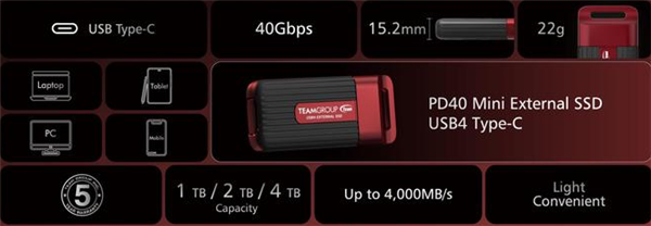 十铨推出TEAMGROUP PD40迷你pSSD:USB4规格 读速4000MB/s