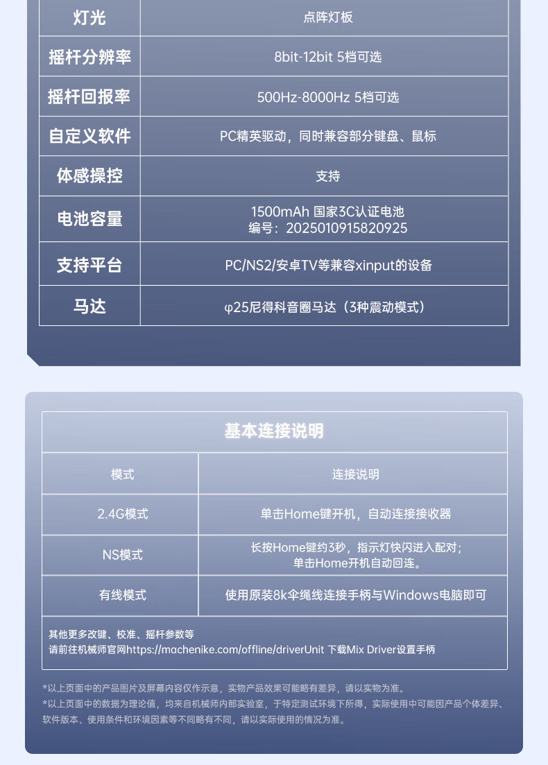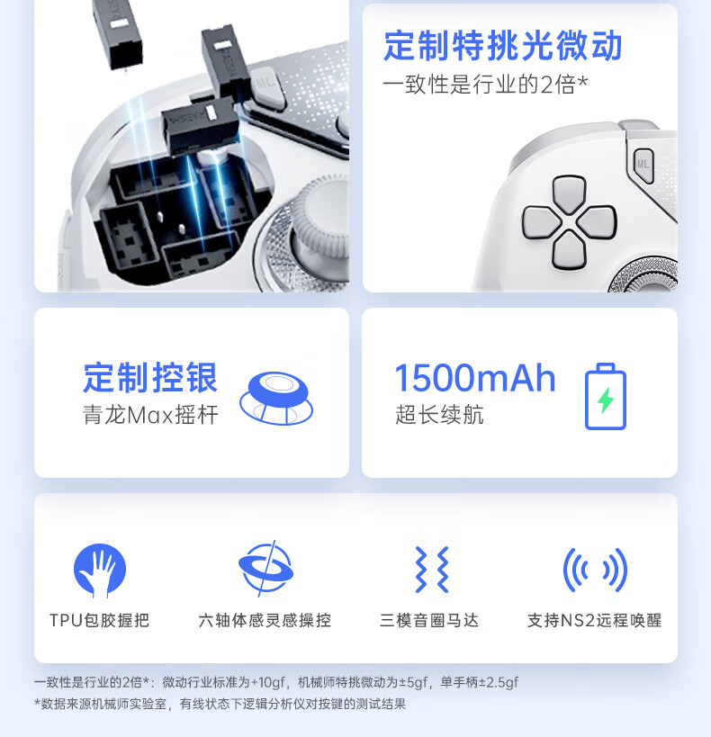 手柄还采用了定制特调光微动,宣称一致性达到行业平均水平的 2 倍,并内置 1500mAh 电池,配备了定制控银青龙 Max 摇杆,握把部分采用 TPU 包胶以增强手感。